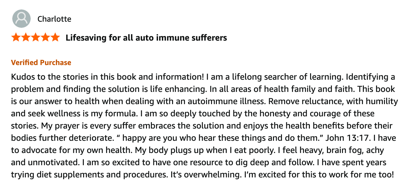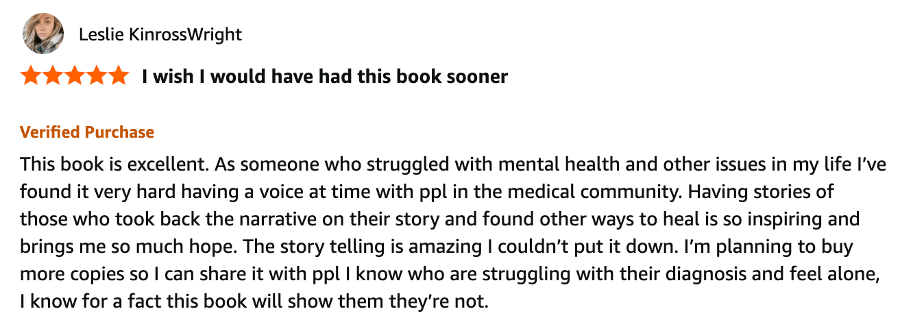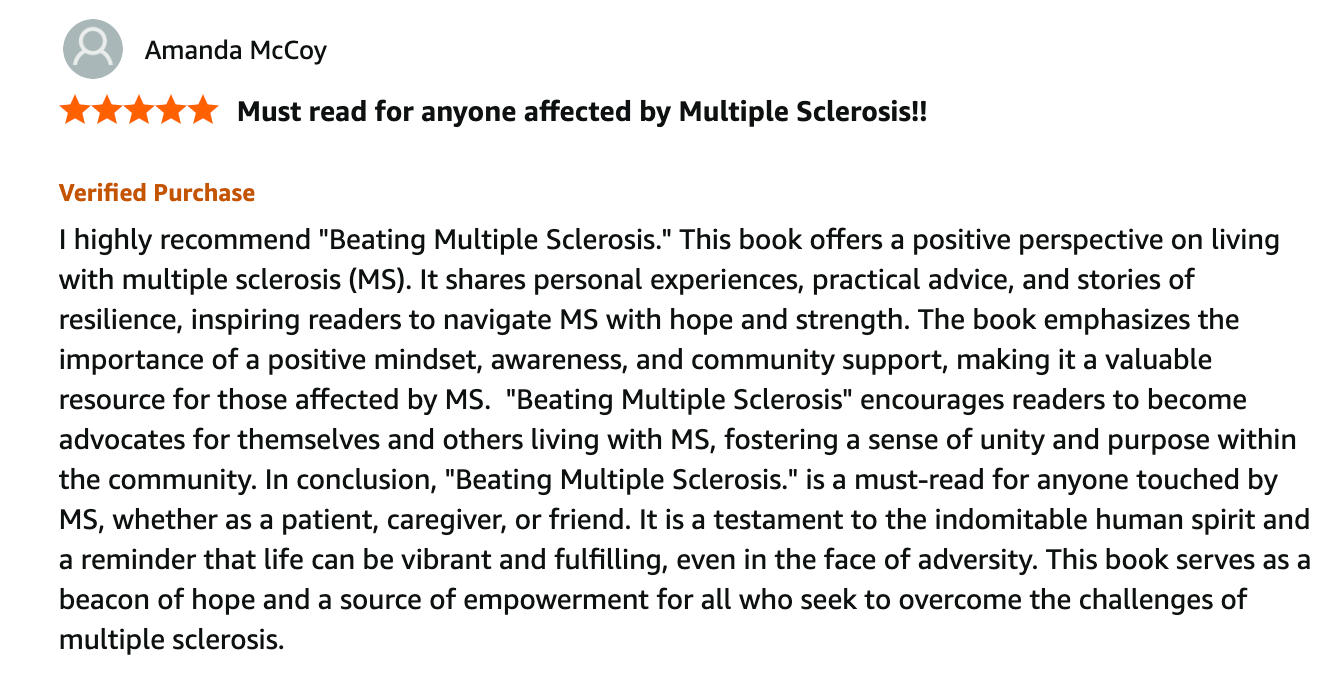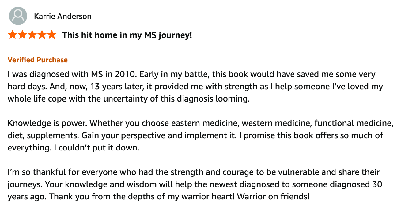 The people behind these stories are your "community as medicine." They show us the power of mindset and belief, and how far we can go with a healing mindset. There is no pharmaceutical as powerful as this. A must read for anyone who is determined to live well with MS.